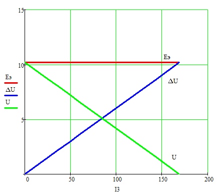 Падение напряжения на внутреннем сопротивлении реального источника ЭДС линейно растет с ростом тока, а напряжение сопротивлении нагрузки линейно падает с ростом тока.