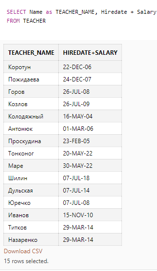 SELECT Name as TEACHER_NAME, Hiredate + SalaryFROM TEACHER;