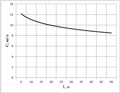 Анализируя полученные результаты можно прийти к выводу, что водоем сильно загрязнен. Это можно увидеть из полученных значений концентраций на расстоянии L = 50 м: Св_= 8.3 мг/л, Сст.пред = 1.31 мг/л , обе величины значительно превышают предельно допустимую концентрацию в водоёме ПДК=0.5 мг/л. Из этого можно сделать вывод, что следует принять меры по уменьшению загрязнения водоема а предприятие, сбрасывающее в него свои сточные воды необходимо проверить на санитарные нормы.