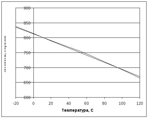 Рисунок 4. Графическая зависимость плотности бензола от температуры для опытных данных, полученных по уравнениям регрессии первой степени.