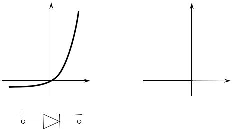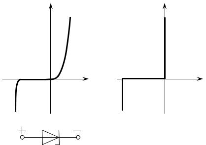 На рис. 5.1, а изображена ВАХ полупроводникового диода и приведено его схемное обозначение. Характеристику диода можно идеализировать, как показано на рис. 5.1, б. В этом случае диод можно рассматривать как ключ, замкнутый при положительном (прямом) и разомкнутый при отрицательном (обратном) напряжениях.