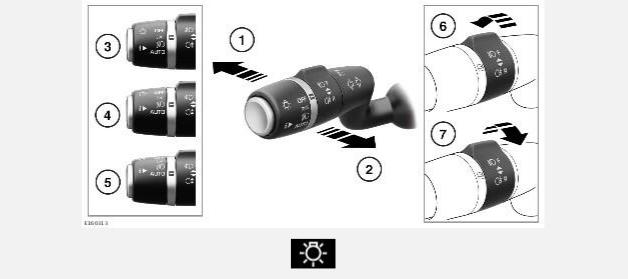 1.Дальний свет: при включенных фарах нажмите на переключатель освещения в направлении от рулевого колеса, чтобы включить дальний свет. На панели приборов загорается сигнализатор. См. ДАЛЬНИЙ СВЕТ (СИНИЙ).