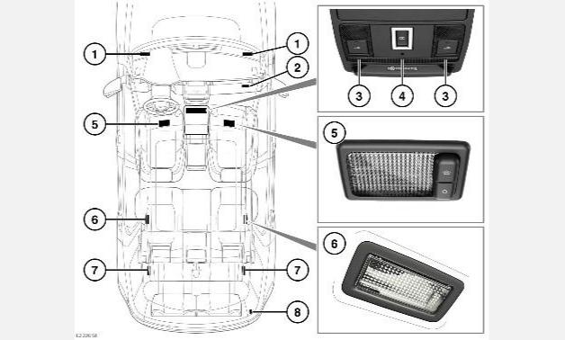 4.Плафон освещения передней части салона: включается при отпирании дверей. Он выключается примерно через 30 секунд после закрывания всех дверей, при запуске двигателя или запирании автомобиля. Поднесите палец к соответствующему плафону или коснитесь его, чтобы включить или выключить лампу вручную. Чтобы деактивировать или активировать автоматический режим освещения, прикоснитесь к плафону на две секунды.