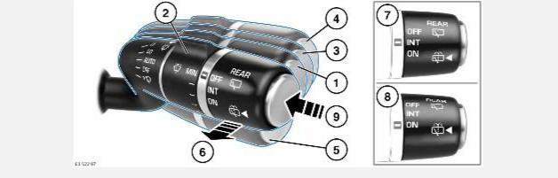 7.INT (Прерыв.): прерывистая работа заднего стеклоочистителя. Частота взмахов увеличивается со скоростью автомобиля.
