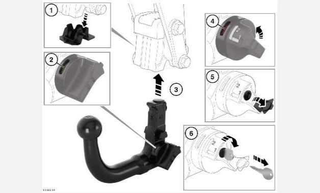 6.Вставьте ключ. Поверните ключ по часовой стрелке, чтобы заблокировать рукоятку съемной шаровой опоры тягово-сцепного устройства. Извлеките ключ. Установите защитную крышку. Положите ключ в безопасное место.