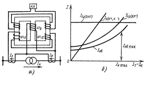 При внешних к.з токи тормозных обмоток создают магнитный поток насыщающий крайние стержни магнитопровода, и ток срабатывания возрастает пропорционально току в тормозных обмотках. При к.з. в зоне диф. защиты ток в рабочей обмотке Iр (вт.к) имеет большую величину и защита, несмотря на подмагничивание тормозным током, срабатывает .