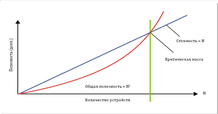 Общая полезность V сети пропорциональна квадрату числа общающихся по ней устройств: когда каждый из N узлов соединяется с N-1 остальных узлов, V будет пропорциональна числу возможных соединений, N* (N — 1), то есть приблизительно N2