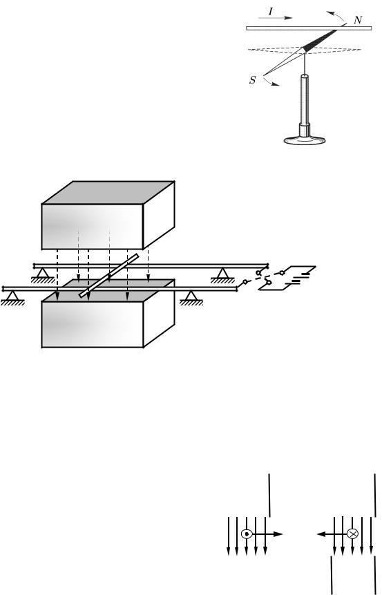 4 Історичним у розумінні сутності магнітного поля став дослід Ерстеда (1820 р.). Ерстед розмістив над магнітною стрілкою прямолінійний провідник (рис. 1.3) паралельно стрілці. Стрілка могла вільно обертатися навколо вертикальної осі. Коли по провіднику пропускали електричний струм, магнітна стрілка відхилялася й встановлювалася перпендикулярно до провідника. При зміні напрямку струму стрілка поверталася на 180°. Те саме відбувалося, коли провідник переносили вниз і розміщували під стрілкою. Таким чином, дослід Ерстеда доводить, що в просторі, який оточує електричний струм, створюється магнітне поле.