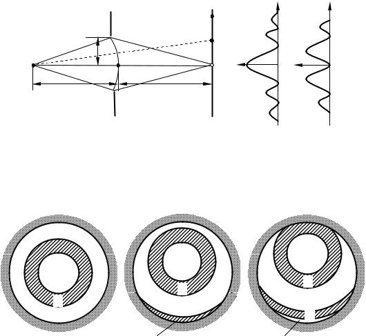 2 З'ясуємо характер дифракційної картини, що буде спостерігатися на екрані, який поміщено за перешкодою (див. рис. 56.1). Внаслідок симетричного розміщення отвору відносно прямої SP освітленість у різних точках екрана буде залежати тільки від відстані r до точки P . У самій цій точці інтенсивність буде досягати максимуму або мінімуму залежно від того, яким – парним або непарним – є число відкритих зон Френеля. Нехай, наприклад, це число дорівнює трьом. Тоді в центрі дифракційної картини буде максимум інтенсивності. Картина зон Френеля для точки P подана на рис. 56.2а). Тепер змістимося по екрану в точку P′. Обмежена краями отвору картина зон Френеля для точки P′ буде мати вигляд, показаний на рис. 56.2б). Краї отвору закриють частину 3-ї зони, одночасно частково відкриється 4-та зона. У результаті інтенсивність світла зменшиться й при деякому положенні точки P′ досягне мінімуму. Якщо зміститися по екрану в точку P′′ , краї отвору частково закриють не тільки 3-тю, але й 2-тю зону Френеля, одночасно частково відкриється 5-та зона (рис. 56.2в). У результаті вплив відкритих ділянок непарних зон переважатиме вплив відкритих ділянок парних зон і інтенсивність досягне максимуму, щоправда, більш слабкого, ніж максимум, який спостерігається в точці P .