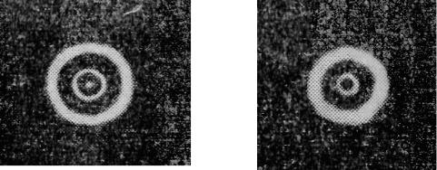 Таким чином, дифракційна картина від круглого отвору має вигляд світлих і темних концентричних кілець. У центрі картини буде або світла ( m непарне), або темна ( m парне) пляма (рис. 56.3). Зміна інтенсивності I від відстані r від центра картини зображена на рис. 56.1. При переміщенні екрана паралельно самому собі вздовж прямої SP картини зображення на рис. 56.3 будуть змінювати один одного (згідно з (56.2) при зміні b значення m стають то непарними, то парними).