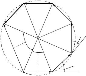 векторних діаграм. Згідно з методом векторних діаграм кожне коливання зображується вектором, модуль якого дорівнює амплітуді коливання, а кут між напрямком цього вектора та напрямом, який взято за вихідний, дорівнює початковій фазі коливання. Відповідно до (58.3) вектори усіх коливань мають однакову амплітуду A . Початкові фази коливань є різними і відрізняються на одну і ту саму величину, що дорівнює δ . Якщо скласти ці вектори геометрично, то неважко побачити, що вони утворюють частину багатокутника, який вписано в коло радіусом R . З рисунка випливає, що:
