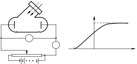 Отримана на такому приладі вольт-амперна характеристика (тобто крива залежності фотоструму I від напруги між електродами U ) наведена на рис. 73.3. Зрозуміло, що вольтамперна характеристика знімається при незмінному потоці світла Φ . Із цієї кривої видно, що при деякій не дуже великій напрузі фотострум досягає насичення – всі електрони, які випущені катодом, попадають на анод. Отже, сила струму насичення Iн визначається