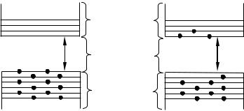 відмінних від 0o К , частина електронів з верхніх рівнів валентної зони переходить у результаті теплового збудження на нижні рівні зони провідності (рис. 99.1б). У цих умовах електричне поле отримує можливість змінювати стан електронів, що знаходяться у зоні провідності. Крім того, внаслідок утворення вакантних рівнів у валентній зоні електрони цієї зони також можуть змінювати свою швидкість під впливом зовнішнього поля. У результаті електропровідність напівпровідника стає відмінною від нуля й визначається процесами двох типів: рухом вільних електронів у зоні провідності й рухом валентних електронів(зв'язаних електронів із кристалічною решіткою) у валентній зоні.