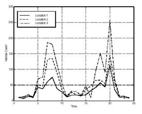 Рассмотрим гипотетический числовой пример, который основан на ежечасном подсчете числа машин, проходящих через три различные пункта в течении 24 часов. Допустим, результаты наблюдений дают следующую матрицу count