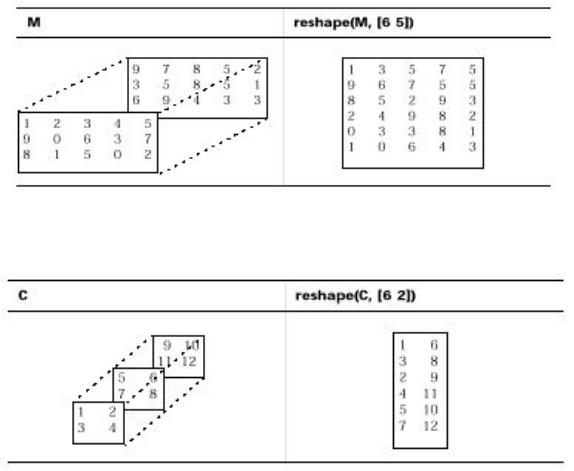 Если вы не меняете форму или размер, массивы в системе MATLAB сохраняют размерности, заданные при их создании. Вы можете изменить размер массива путем добавления или удаления элементов. Вы можете также изменить форму массива изменяя размерности строк, столбцов и страниц, при условии сохранения тех же элементов. Функция reshape выполняет указанную операцию. Для многомерных массивов эта функция имеет вид