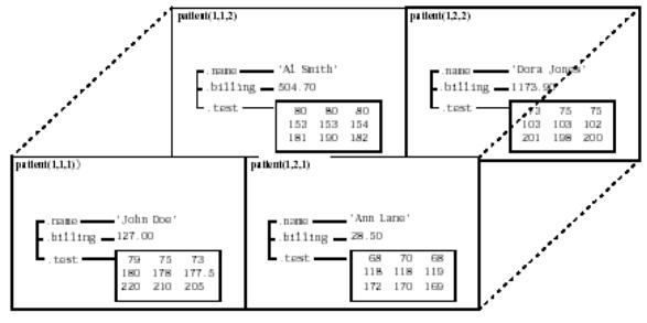 patient(1,1,1).name = 'John Doe'; patient(1,1,1).billing = 127.00;