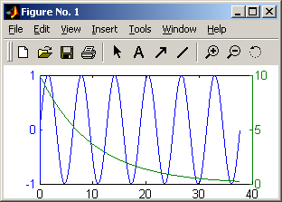»plotyy(x, sin(x), x, 10*exp(–0.1.*x))