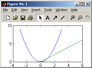 fplot(<имя функции>, limits) строит график функции (функций) в интервале limitsº=º[xmin, xmax]. В качестве имени функции может использоваться m-файл или строка типа 'sin(x)', '[sin(x) cos(x)]', '[sin(x), myfun1(x), myfun2(x)]'. Можно установить размеры графика по оси значений функции limitsº=º[xmin, xmax, ymin, ymax];