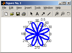 »f = 0 : 0.02 : 2*pi »r = sin(2.*f).*cos(2.*f); »hp = polar(f, r), hold on »set(hp, 'LineWidth', 4) |