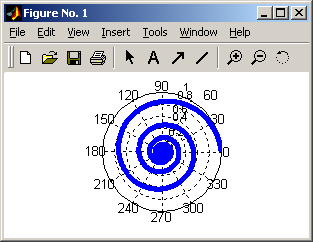 »f = 0 : 0.01 : 15*pi »r = exp(–0.1*f); »hp = polar(f, r), hold on »set(hp, 'LineWidth', 4) |