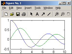С помощью команды: »fplot('[besselj(0, x) besselj(1, x) 0]', [0 10], [ ], 20) обеспечивается построение графиков двух функций Бесселя (рис. 4.4) для указанного диапазона аргумента [0 10]. |