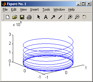 Команда plot3(x, y, z) в тех же вариациях, что и plot, предполагает задание одномерных и двумерных массивов – строятся точки с координатами x(i,:), y(i,:), z(i,:) для каждого столбца и соединяются прямыми линиями. Применив команды: »t = 0.01 : 0.01 : 20*pi; »plot3(cos(t), sin(t), t.^3) получим «пружину» (рис. 4.7). |