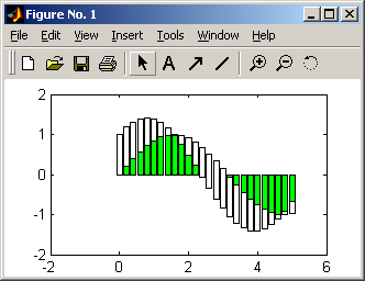 »x = 0 : 0.1 : 5; »y1 = sin(x); y2 = cos(x); »y = [y1; y2]; »bar(x, y, 'stack') |