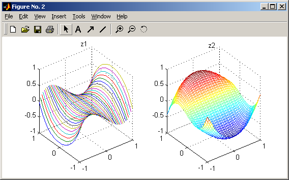 Вывод графиков в нескольких окнах рисунка: subplot(m n k), subplot(m, n, k), где m – число окон по горизонтали, n – по вертикали, k – номер окна. На рис. 4.15 представлены две области построения трехмерных изображений