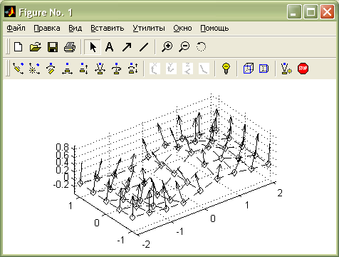 Для построения графиков полей градиента служат команды quiver: quiver(X, Y, U, V) строит график поля градиентов в виде стрелок для каждой пары элементов массивов X и Y, причем элементы массивов U и V указывают направление и размер стрелок; quiver(U, V) строит векторы скорости в равнорасположенных точках на плоскости (х, y); quiver(U, V, S) или quiver(X, Y, U, V, S) автоматически масштабирует стрелки по сетке и затем вытягивает их по значению S; quiver(..., LINESPEC) использует для векторов указанный тип линии. Указанные в LINESPEC маркеры рисуются у оснований, а не на концах векторов. Для отмены любого вида маркера используйте спецификацию '.'. Спецификации линий, цветов и маркеров были подробно описаны в 4.1; quiver(..., 'filled') дает график с закрашенными маркерами; H = quiver(...) строит график и возвращает вектор дескрипторов. Пример применения команды quiver представлен на рис. 4.22.