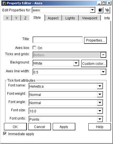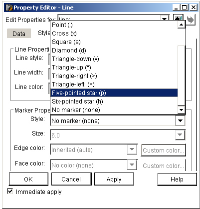 1) форматирование линий графиков: есть возможность настройки и изменения свойств графиков. Команды Figure Properties (свойства фигуры) и Axis Properties (свойства осей) со всеми необходимыми настройками (рис. 4.27). Используют кнопку Edit Plot (Редактировать график), на панели инструментов окна графики с помощью двойного щелчка левой кнопкой мыши выбирают объект графика, вызвав тем самым окно его форматирования. В этом окне открыта вкладка Style (Стиль), которая устанавливает стиль отображения линии (ее вид, ширину и цвет, параметры маркеров, отмечающих опорные точки графиков);