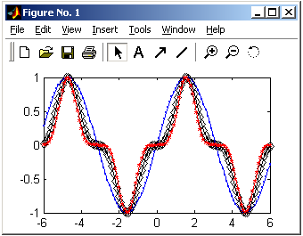 2) форматирование линий и маркеров для графика нескольких функций: для графика нескольких функций можно форматировать линии и маркеры каждой кривой отдельно (рис. 4.27). Выполним следующие команды: »x = –6 : .1 : 6; »plot(x, sin(x), x, sin(x).^3, x, sin(x) .^5); |