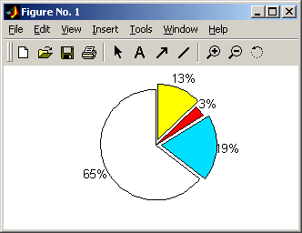 Секторная диаграмма (рис. 4.18) реализуется командой h = pie(...), pie(x), pie(x, y), где y – вектор из 0 и 1 для отделения от диаграммы части секторов.
