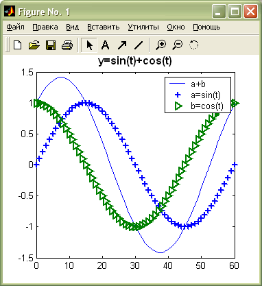 »subplot(1 1 1) »t = [0 : pi/30 : 2*pi]; »a = sin(t); b = cos(t); »x = 0 : 60; »plot(x, a+b), hold on »hp=plot(x, 'a', '+', x, 'b', '>'); »set(hp, 'LineWidth', 2) »legend('a+b', 'a=sin(t)', 'b=cos(t)') »title('y=sin(t)+cos(t)' ,'FontSize', 12, 'FontWeight', 'bold') |