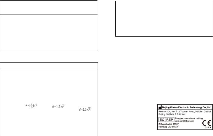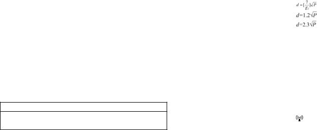 Для передатчиков с максимальной выходной мощностью, не перечисленных выше, рекомендуемое расстояние в метрах (м) можно оценить с помощью уравнения, применимого к частоте передатчика, где P является максимальной номинальной выходной мощностью передатчика в ваттах (Вт) согласно данным производителя передатчика.