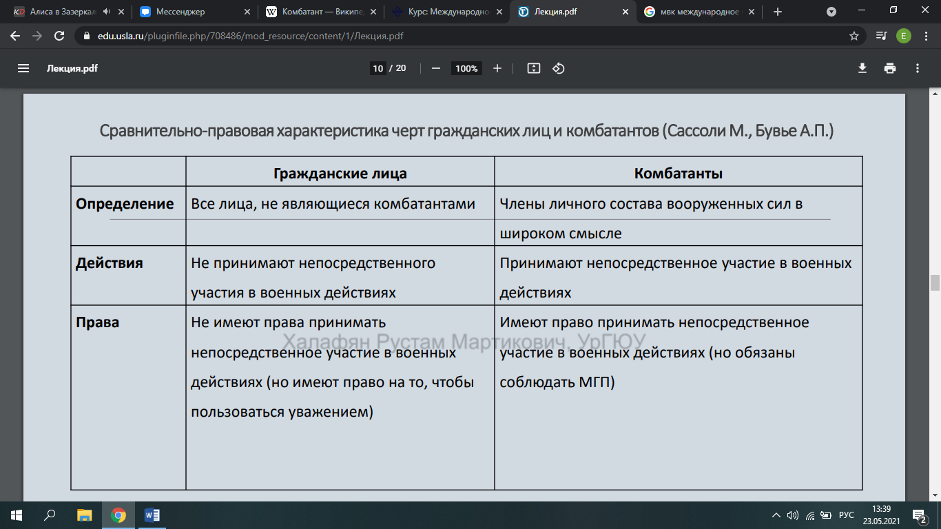 Комбатанты – лица входящие в состав вооруженных сил стороны, находящийся в конфликте и принимающие непосредственное участие в боевых действиях.