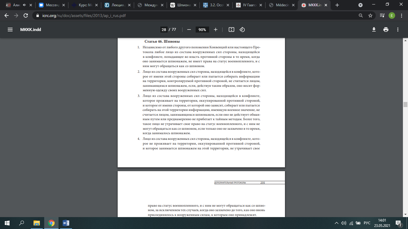 Любое лицо из состава вооруженных сил стороны, находящейся в конфликте, попадающее во власть противной стороны в то время, когда оно занимается шпионажем, не имеет права на статус военнопленного, и с ним могут обращаться как со шпионом.