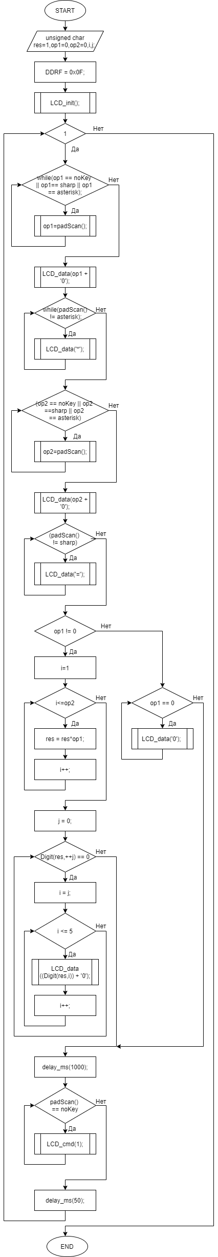 Вывод: Используя навыки, полученные при выполнении предыдущей лабораторной работы по программированию вывода информации на ЖКИ индикатор, был разработан калькулятор, выполняющий операцию возведения в степень целого десятичного числа. С клавиатуры вводится число, после нажатия клавиши * – показатель степени, а результат выводится после нажатия клавиши #. В ходе работы были использован циклы с предусловием циклы с постусловием и циклы с условием, а так же вспомогательные подпрограммы.