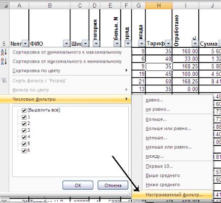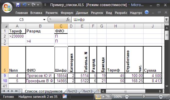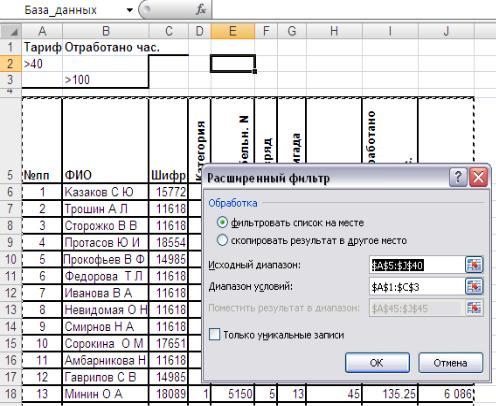 Пусть из списка персонала, приведенного на рис 6.1, нужно выделить как работников с тарифом (столбец Тариф) выше 40 , так и работников, отработавших более 100 час (столбец Отработано час.).