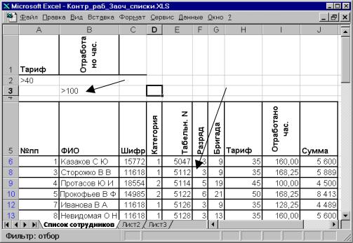 На рис.6.6 в ячейках А1:В3 критерии записаны в виде обыкновенных меток. Под заголовком Тариф введено >40, под заголовком Отработано час. введено >100.