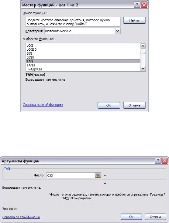 •вызовем Мастер функций, при этом появится диалоговое окно первого шага, представленное на рис. 2.3, выберем категорию функций Математические и в появившемся списке функций укажем TAN
