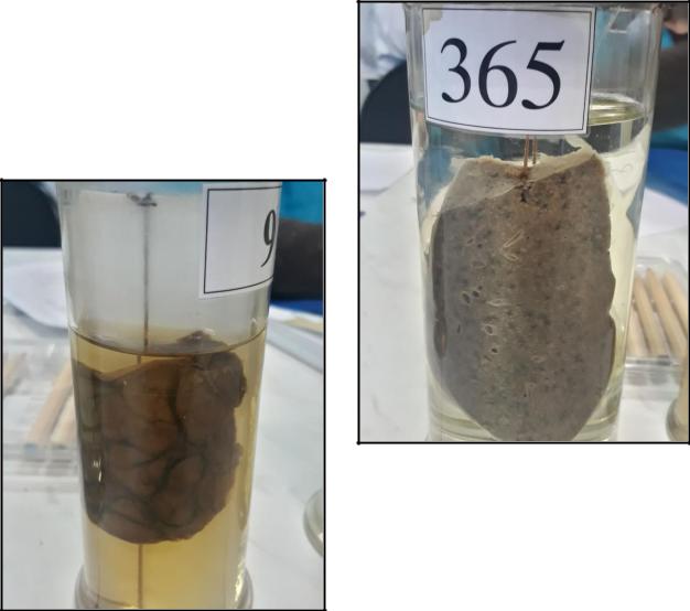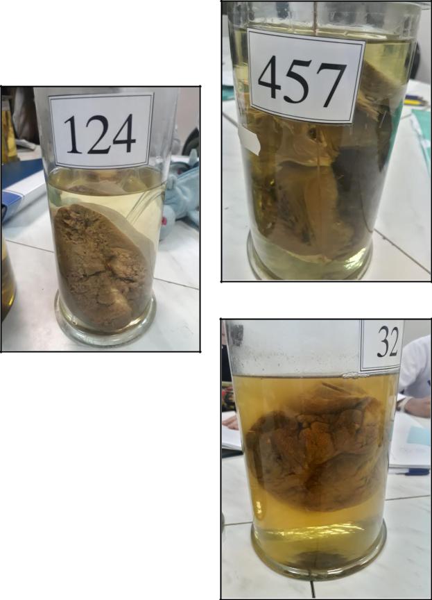 Доля легкого несколько увеличена в размерах, плотной консистенции, серого цвета.