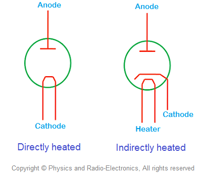 In the vacuum triode, the cathode is heated to emit the free electrons. This can be done in two ways: by directly heating the cathode or indirectly heating the cathode.