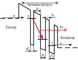 Нижчий робочий рiвень спустошується за рахунок переходiв 2 —1 i електрони переходять в третю яму звiдки вони електричнимполем переводяться в колектор.