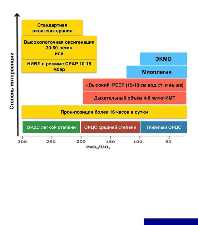 методов респираторной терапии для улучшения результатов лечения: при ОРДС легкой степени (PaO2/FiO2 200-300 мм рт.ст. или SpO2 80-90% при дыхании воздухом) рекомендовано использование стандартной оксигенотерапии (через лицевую маску или назальные канюли), высокопоточной оксигенации (ВПО) или неинвазивной ИВЛ (НИВЛ) в сочетании с прон-позицией, при ОРДС средней и тяжелой степени (PaO2/FiO2 обычно менее 150 мм рт.ст. или SpO2 менее 75% при дыхании воздухом) показана интубация трахеи и инвазивная ИВЛ в сочетании с пронпозицией (схема 1).