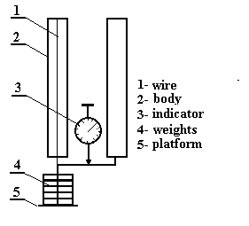 Wire 1 is fixed on body 2. Platform 5 is fixed to the end of the wire. Weights 4 are placed on the platform. Lengthening of the wire is measured with the indicator of lengthening 3.