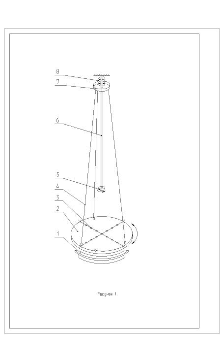 Момент iнерцiї матеріального тіла – це скалярна фізична величина, яка є мірою iнертностi тіла в обертальному русi. Момент iнерцiї залежить від маси, форми та розмiрiв тіла, розподілення маси відносно осi обертання, вибору осi обертання. У цій роботі використовується пристрій на тринитковому підвісі, який дозволяє визначити моменти iнерцiї простих тіл. Пристрій складається з диску (2), котрий приводиться у коливальний рух за допомогою приводу (6). Внаслідок повороту рукоятки приводу (5) відбувається закручування пружини (8), котра, розкручуючись, передає імпульс обертального руху верхньому диску (7). Металеві нитки (4) дещо нахиляться, від чого центр мас системи зміщується вздовж осi обертання.
