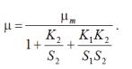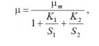 де K1 і K2 - ефективні константи спорідненості мікроорганізму до субстратів S1 і S2. Для механізмів групи (1) рівняння питомої швидкості росту може бути записано у вигляді