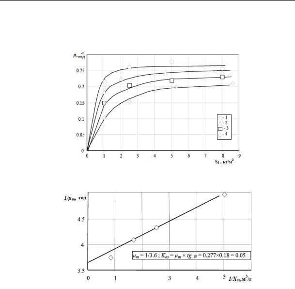 Рис. 19. Зміна питомої швидкості росту сумарної біомаси від концентрації фруктози S1. Експериментальні точки (1-4): 1 - S2 = 1,2 кг/м3; 2 - 0,6; 3 - 0,4; 4 - 0,2