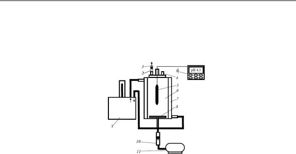 1 – ультратермостат, 2 – фільтр очищення повітря; 3 – штуцер виходу повітря, 4- штуцер введення середовища та відбирання проб, 5 – електрод рН-метра, 6 – ємність культиватору, 7 – рубашка, 8 – барботер, 9 -іонометр, 10 –ротаметр, 11компресор.