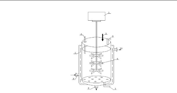 1 – мотор; 2 – подача живильного середовища; 3 – деаератор (прилад для очищення від присутніх небажаних газових домішок); 4 – система контролю параметрів живильного середовища; 5 – охолоджуюча або обігріваюча рубашка; 6 – мішалка; 7 – аератор; 8 – отвір для виведення біомаси; 9,10 – подача та вихід холодної або теплої води відповідно.